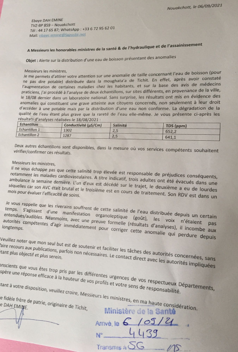 أنتهز هذه الفرصة لأُعلمكم أني كنت قد راسلتُ وزارتي المياه والصحة (الرسالة المرفقة والتي تم استلامها من القطاعين بتاريخ 06 سبتمبر أيلول 2021) للتدخل العاجل لمساعدة أهل المدينة لتحسين جودة المياه الشروب الموزعة، نظراً لتأثيرها السلبي الملاحظ حينها على صحة كبار السن والذي بينتهُ في الرسالة مع نتائج تحاليل المياه. لا تترددوا، سيدي الرئيس، في توجيه باقي القطاعات الخدمية كالتعليم والطاقة ووكالة تآزر…بضرورة دعم صمود ساكنة المدينة والذي أشدتم به مشكورين.