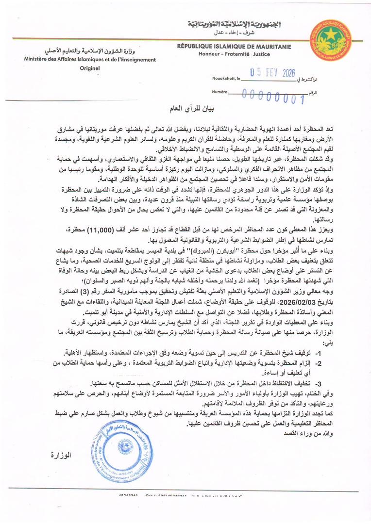 وقالت الوزارة في بيان صادر عنها اليوم أنه تم بناء على تقرير البعثة التي أوفدتها إلى المحظرة توقيف شيخ المحظرة عن التدريس إلى حين تسوية وضعيته وفق الإجراءات المعتمدة، واستظهار الأهلية.